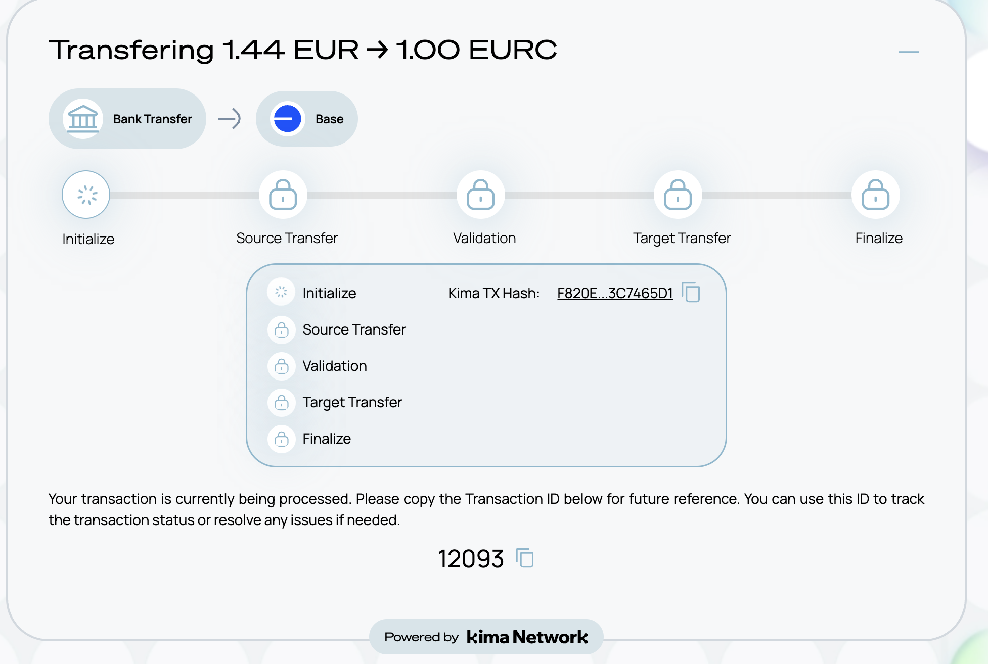Once you're ready, click on the finish button. This will send the needed transaction request to the kima blockchain. From there, you can track the current state of the transaction in the Kima blockchain.