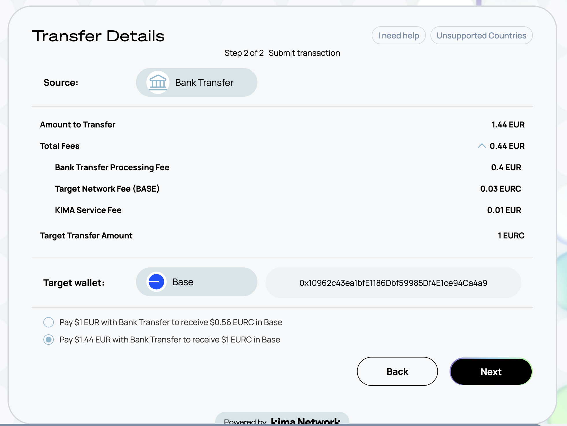 > ℹ️ Check the list of [unsupported Countries](https://docs.kima.network/kima-network/supported-fiat#unsupported-countries-credit-cards)