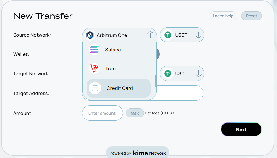 Credit card transactions require the use of the [Kima Transaction Widget](https://docs.kima.network/kima-network/the-kima-sdk/add-kima-widget-to-your-app). This is a frontend React component which handles integration with Kima and 3rd party components which handle KYC and payment processing.