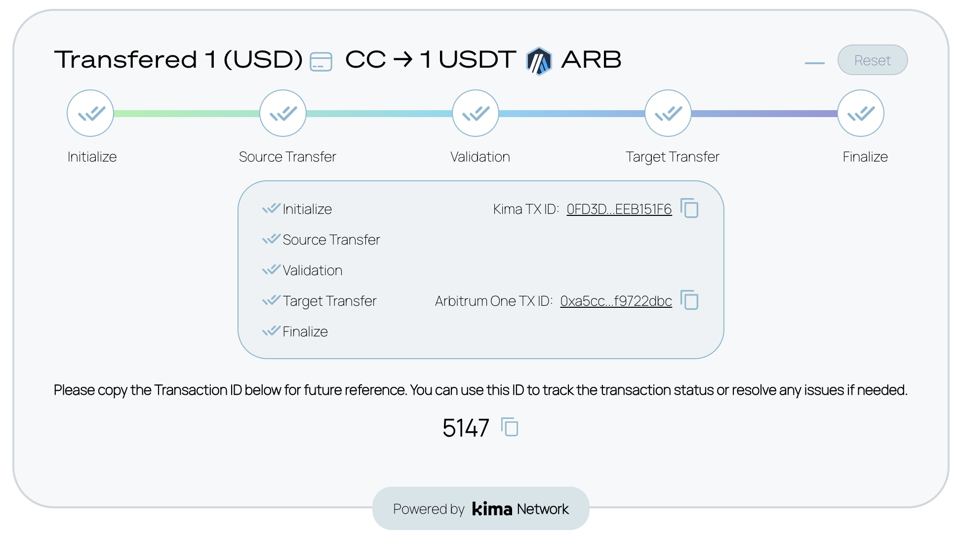 If your transaction succeeds you will see the status screen, where you can track the current state of the transaction in the Kima blockchain.