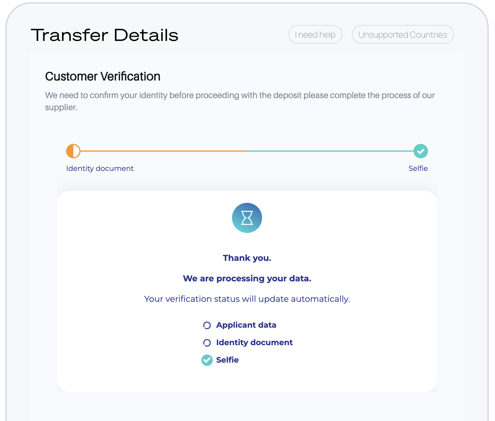 <figure><img src="https://3134460121-files.gitbook.io/~/files/v0/b/gitbook-x-prod.appspot.com/o/spaces%2FJ6zSf6jJsAYmovV6Wkcr%2Fuploads%2Fgit-blob-daa9fc7959254b12d32293c1931f49ace2afaea3%2Fcc_widget_kyc_processing.png?alt=media" alt=""><figcaption></figcaption></figure>