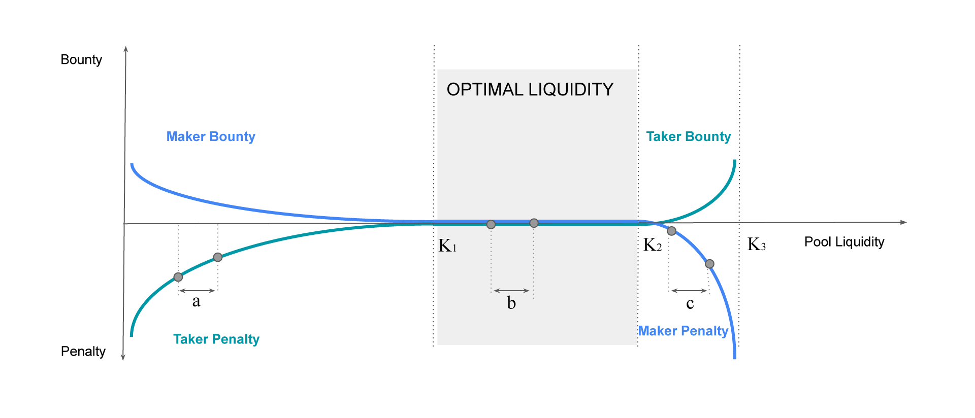 As can be seen, transactions taking place between K1 and K2 do not incur penalties. However, as soon as liquidity goes out of this range (meaning someone paid the penalty), there is an incentive for someone else to bring the liquidity back to the K1-K2 range and collect a bounty.